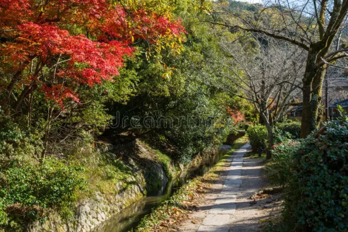 The Philosopher’s Path is one of Kyoto’s most beloved walking routes, especially during autumn. Stretching about two kilometers along a quiet canal, this path is lined with maple trees that turn soft shades of red, orange, and gold as fall sets in.